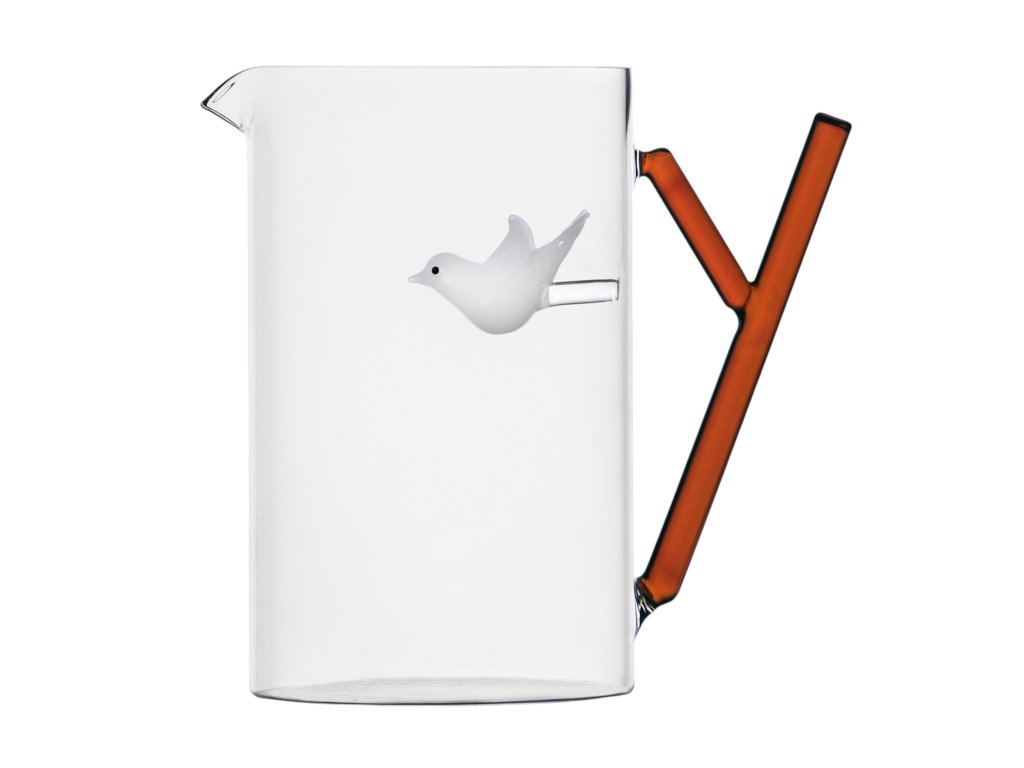 Sklenený džbán s bielym vtáčikom a hnedou rukoväťou z kolekcie Ichendorf Animal Farm s objemom 1450 ml. Dizajn z dielne Alessandy Baldereschi.