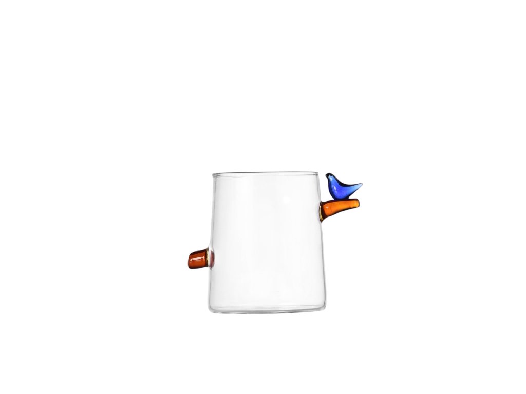 Sklenený pohár na vodu z modrým vtáčikom z kolekcie Ichendorf Birds s objemom 320 ml. Dizajn z dielne Tomoka Mizu.