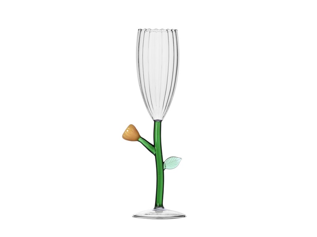 Sklenený pohár na šampanské z kolekcie Ichendorf Botanica, so zelenou stopkou a jantárovo žltým kvetom, s objemom 160 ml.