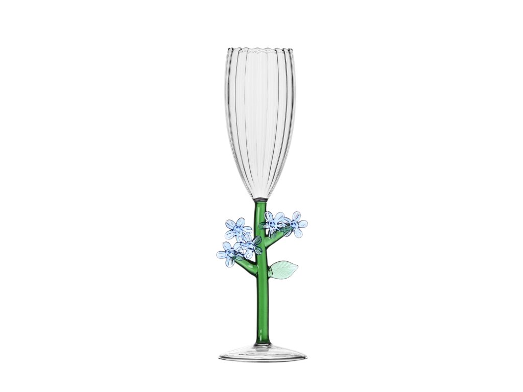 Sklenený pohár na šampanské z kolekcie Ichendorf Botanica, so zelenou stopkou a svetlo modrým kvetom, s objemom 160 ml.