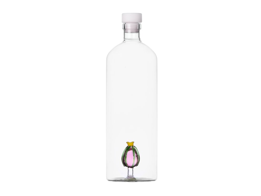 Sklenená fľaša Ichendorf s dekoráciou ružového kaktusového kvetu s objemom 1150 ml. Kolekcia Desert Plants od Alessandri Baldereschi.