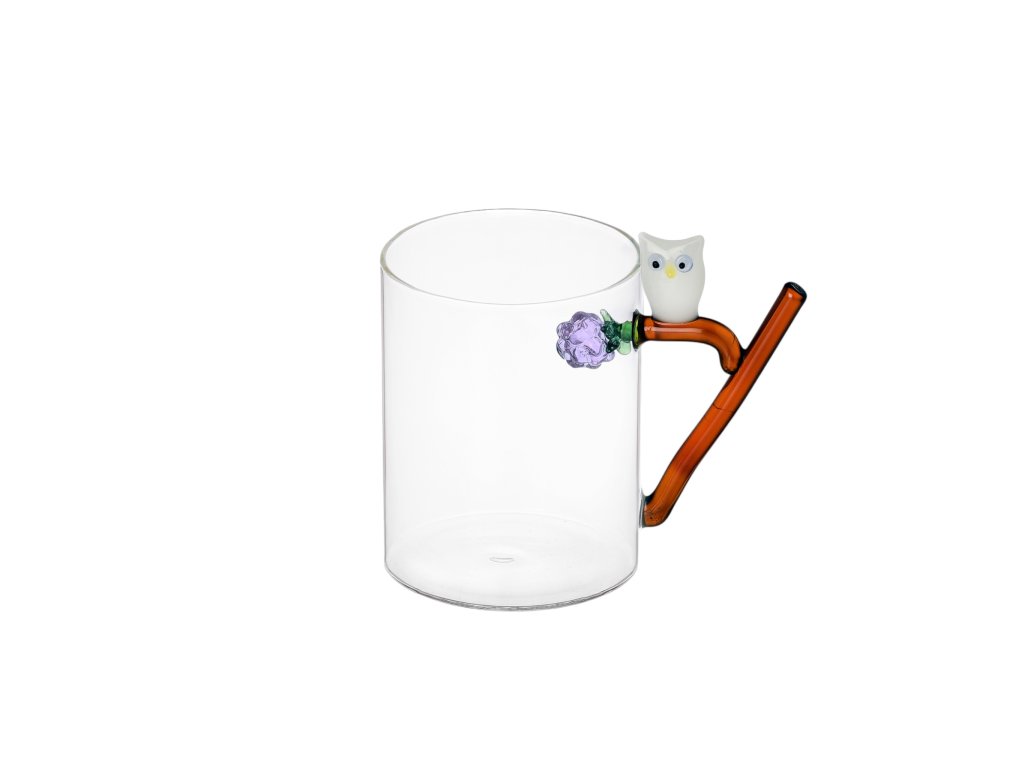 Sklenený hrnček z kolekcie Ichendorf Fruits & Flowers s hnedým uškom a bielou sovičkou, s objemom 450 ml.