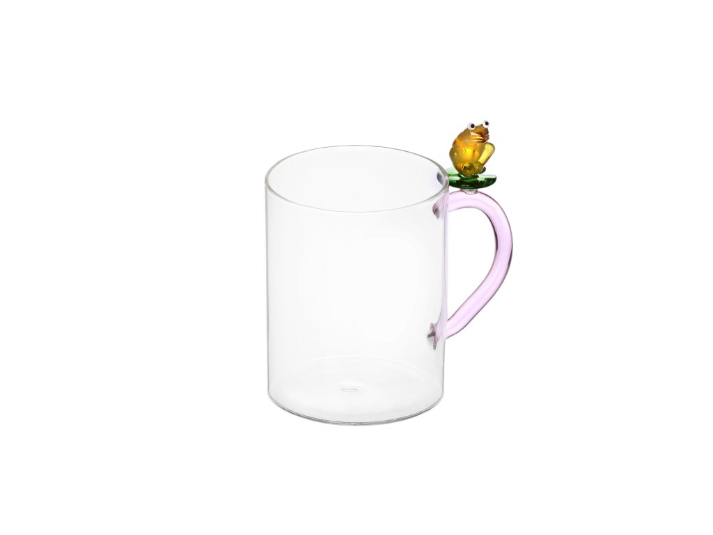 Sklenený hrnček z kolekcie Ichendorf Fruits & Flowers s ružovým uškom a zelenou žabkou, s objemom 450 ml.