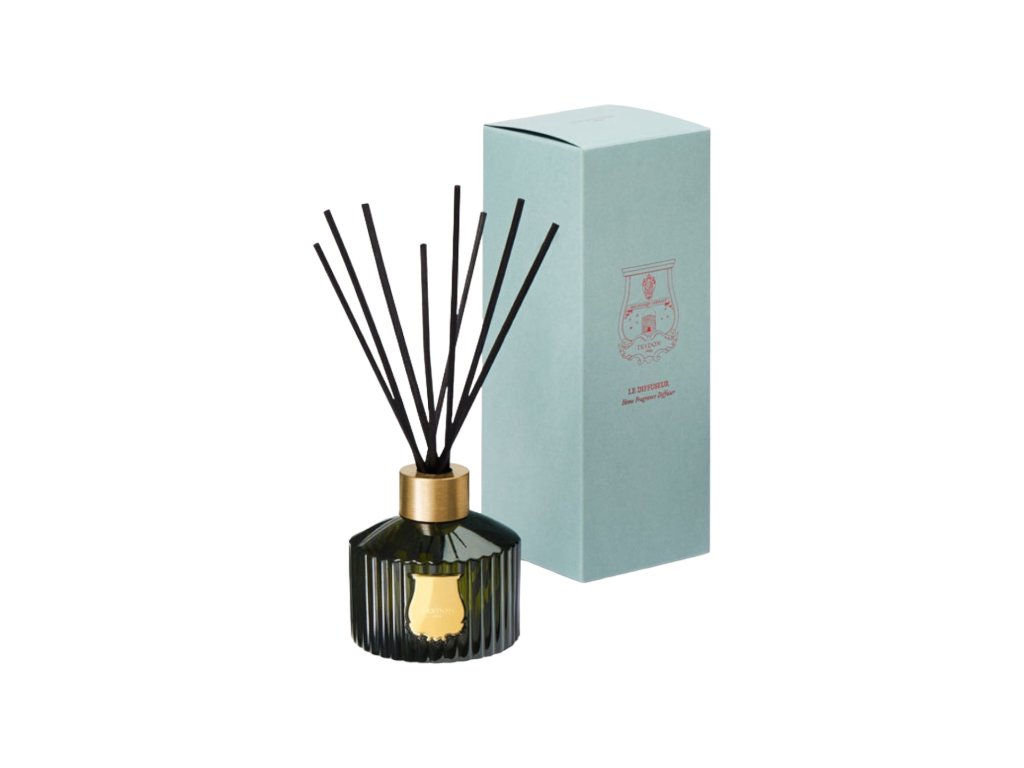 Podobne ako sviečky, aj difuzéry sú vyrábané z prvotriedneho skla v Toskánsku a sú zdobené zlatým emblémom, ktorý je inšpirovaný reliéfom nájdeným v starej kráľovskej voskárni neďaleko Paríža, ktorá kedysi patrila rodine Trudon a v súčasnosti je sídlom cirkevnho rádu Saint-Joseph de Cluny. Každý flakón dopĺňa 8 prírodných ratanových tyčiniek. Bytový difuzér Trudon s 350 ml náplňou sa postupne odparuje vo po dobu 3-4 mesiacov a dotvára tak nezameniteľnú atmosféru vášho domova.
